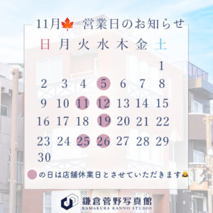 休館日以外にも出張撮影等で営業時間や休みが変更になる場合がございます。 お客様には大変ご不便をおかけいたしますが何卒、ご理解賜りますようお願い申し上げます。